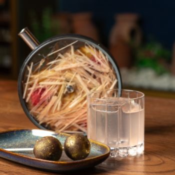 As guests take a bite, the creamy shell shatters to release pearls infused with gin, mezcal, Sherry, and rhubarb cordial – a cocktail that has rested in a clay amphora submerged in seawater for 72 hours.