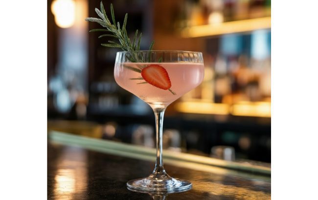- Garnish: sugared rosemary sprig and strawberry slice.