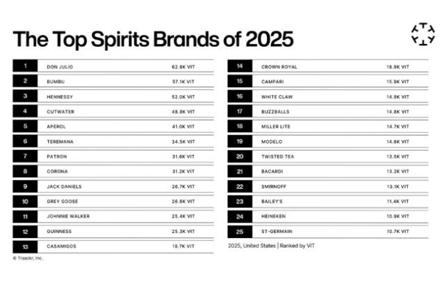 In the list of 2025’s top spirits brands in the US, according to their VIT ranking, Diageo-owned Don Julio Tequila has come out on top, with a VIT score of 62,800. This is followed by Pernod Ricard-backed Bumbu rum (57,100) and LVMH’s Hennessy Cognac (52,000).