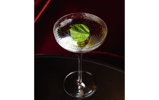 Method: Add all ingredients (except the sweet mastiha spray) to a mixing glass filled with ice. Stir gently until well chilled and perfectly diluted. Strain into a chilled coupe glass. Finish with a light spray of sweet mastiha and garnish with a shiso leaf and green shiso oil.